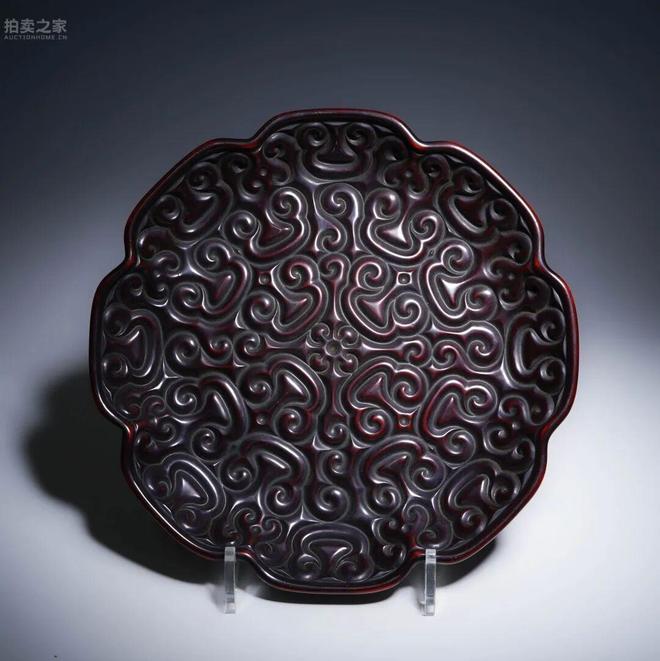 此盤花口式樣,形制端莊大方。通體以堆黑工藝髹成,漆層厚重堅實,漆質溫潤泛紅光。盤面滿飾如意紋,紋飾層層堆起,線條流暢婉轉,佈局繁而不亂,盡顯宋代漆藝的古雅與精湛工巧。器身起伏有致,立體感強烈,觀之古韻盎然。盤底髹黑漆,其上於民國時期以金彩鐫刻乾隆御制詩文,並鈐御璽,詩文與器形相互輝映,賦予此盤更高的文人氣息與歷史層次感。御題雖為後加,然其文化意涵與裝飾效果,令器物更添收藏與陳設之雅趣。