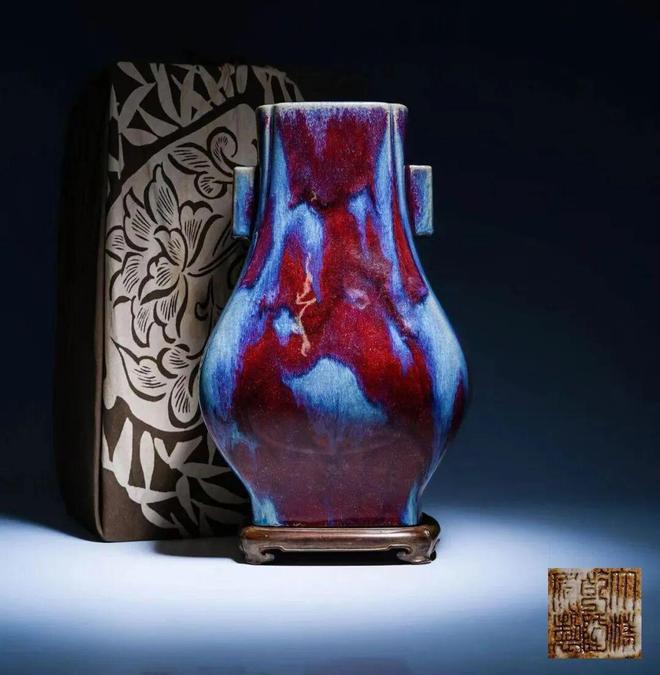 1120 号 清乾隆窑变釉四方倭角杏园贯耳方壶,造型仿商周青铜尊彝,窑变釉色惊艳 —— 红似凝血、蓝若碧海,交融如彩霞。另配旧木盒,墨书 “乾隆宫窑辰砂贯耳花瓶”,完好大器存世寥寥。