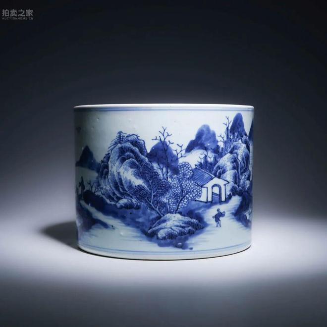 此筆海作圓筒狀,口沿平齊,胎體厚實堅致。外壁以青花繪制山水人物圖景,遠山重疊,溪水潺潺,橋上人物行走,林木繁茂,屋舍點綴其間,意境清遠,極具江南山水之神韻。畫工精細,青花發色豔麗,皴法運用精細,分水濃淡有致,層次分明,頗具康雍時期青花的典型風貌。此器造型端正,氣勢沈穩,青花暈染自然,景致生動傳神,既可為文房陳設之雅器,亦為收藏鑒賞之佳品。