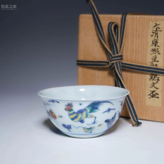 此杯撇口,弧腹,圈足,造型小巧精緻。通體以青花勾勒紋飾,再施以黃、綠、朱、藍等填色,色彩明麗雅致。杯身通景繪公雞、母雞與小雞覓食嬉戲之景,點綴以花卉草石,畫意生動自然,寓意多子多福、家運興旺。胎質細膩,釉面光潤,鬥彩發色柔和清雅,盡顯康熙官窯之典雅格調。底書青花“大明成化年制”款,系康熙朝典型的“以明為尊”之特徵,彰顯清代中期對明代成化鬥彩的仿效與推崇。此類雞缸杯為明清御窯名品,向為收藏界所珍。