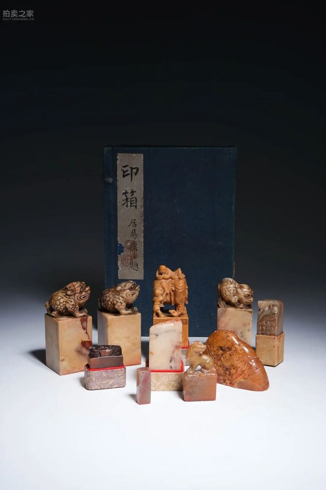 此組印章共十件,取材多為壽山石、芙蓉石等佳材,石質溫潤細膩,肌理斑斕。其鈕制形式多樣,有螭虎、獅獸、瑞禽等,雕工古拙而富生動之趣,線條剛勁有力,展現傳統工藝之精妙。部分印鈕作瑞獸昂首、盤臥之狀,神態雄健,寓意闢邪納福。配以舊制藍色包布印箱,內壁手書題跋並鈐朱文印,文字雅逸,承載濃厚文人氣息。整體保存完好,印章與印箱相得益彰,極具文房陳設與收藏價值。