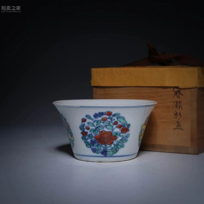 本品敞口、斜壁、圈足,造型端莊雅致,線條流暢挺拔,乃康熙官窯精作。通體以青花勾勒,再填以鬥彩,外壁繪團花紋飾四組,以牡丹、菊花、石榴等為主,花葉層疊繁茂,色彩濃麗而不失清雅,設色鮮明,綠、紅、黃、藍交相輝映,富麗典雅。紋飾佈局嚴謹規整,飽滿而富裝飾感,正是仿自明萬曆鬥彩風格,然筆觸更為工整細膩,色彩調和度亦更高。康熙一朝對前代名器多有摹古之制,此杯即為其代表之一。胎質潔白堅致,釉面光潤如脂,器底以青花書“大明萬曆年制”款,書寫端莊,為康熙官窯仿古之典型特徵。