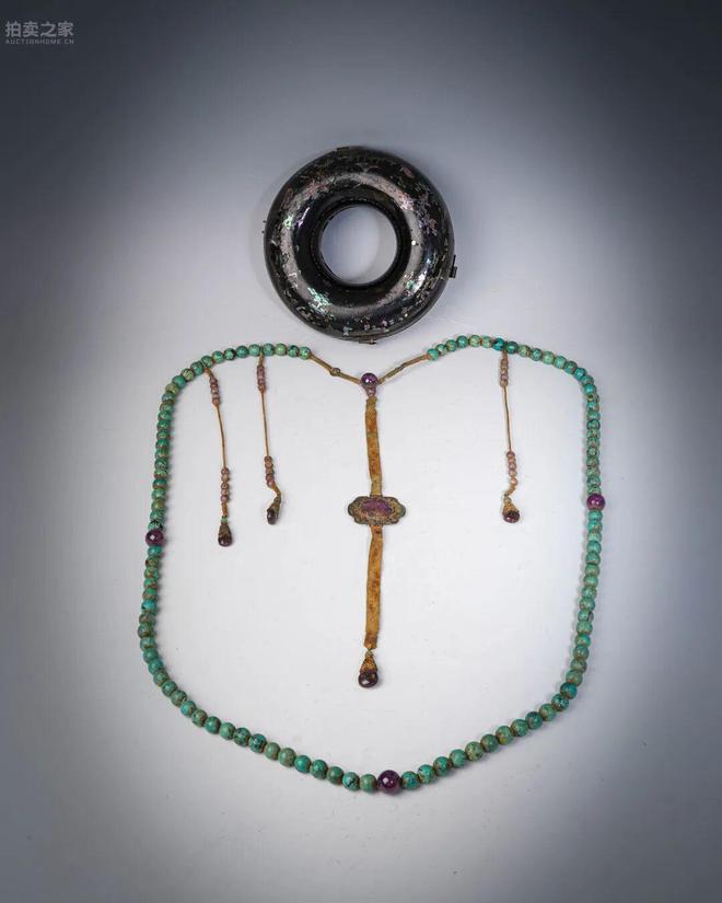 此組朝珠以圓潤綠松石為主料,間飾紫水晶珠,色澤鮮麗,映襯相得益彰。配件包括結珠、佛頭、背雲及墜飾,均保存原貌,古樸可珍。朝珠原為清代宮廷及王公貴族在朝會或典禮時所佩帶之飾物,用以莊重儀容,寓含等級制度與嚴格禮制。隨附一件黑漆嵌螺鈿朝珠盒,螺鈿光彩斑斕,歷經歲月仍見瑩潤華彩,與朝珠成套保存,殊為難得。此件器物不僅材質名貴,且承載清代宮廷禮制與審美意趣,實為難得之收藏佳品。