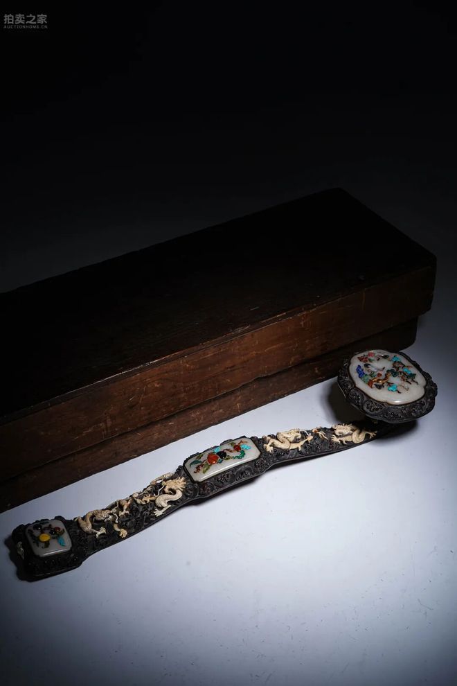 此如意以紫檀木為體,通體浮雕海水江崖紋地,上飾翻騰蛟龍,氣勢磅礴。柄身分設三塊白玉嵌板,其上以百寶嵌工藝鑲飾松石、碧玉、瑪瑙等諸寶,分別錦繡花卉、瑞禽靈芝,色彩斑斕,寓意吉祥。頭部白玉嵌板浮雕仙鶴、花木,象徵延年益壽,祥瑞昌隆。背面陰刻「三陽發歲韶華富 萬象維新嘉祉綿 敬書題」並鈐印「臣王傑」,文辭典雅,尤增歷史價值。此器集紫檀精雕、百寶嵌玉、龍紋圖飾及詩銘題款於一體,製作華美繁縟,兼具宮廷氣象與文人風雅,誠為陳設賞玩與收藏之佳品。