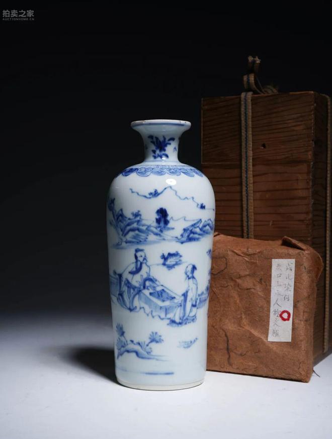 此梅瓶小巧秀雅,通體胎質堅緻潔白,施白釉,釉面光潤。器形豐肩,收腰漸斂,至足處略收,造型端莊而挺拔。外壁以青花繪「秋山對弈」圖:遠山層巒,松石蒼翠,溪流環繞,一側茅亭之下,兩高士對坐弈棋,畫面雅逸生動,饒有文人情趣。青花發色層次分明,石青料經高溫燒造後呈現濃淡暈染之效,線條遒勁而富神韻,正是崇禎時期青花的典型風格。整體構圖疏朗有致,既承明代文人繪畫傳統,又具時代鮮明特色。梅瓶原為酒器或陳設之用,此件雖體量不大,但繪工精細、氣韻高古,頗具藝術與收藏價值。