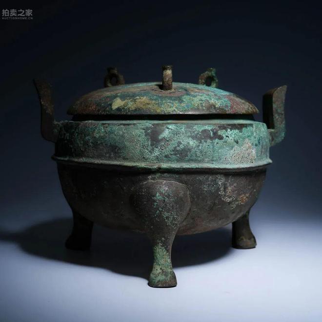 此鼎通體以青銅鑄成,設雙耳、圓腹、下承三足,並於腹部飾一條橫系,增添裝飾與結構感。蓋作覆盂狀,上設鈕首,與器身渾然一體。青銅質地厚重,經漫長歲月,表面滿布藍綠色銹斑與土沁,古樸蒼茫,呈現出強烈的歷史陳跡。戰國時期青銅器造型逐漸趨於實用與莊重並重,此件雙耳三系鼎造型雄渾,氣勢莊嚴。其用途多與祭祀、禮儀及宴饗相關,為貴族權力與地位之象徵。三足穩固,器形勻稱,既實用又兼具審美意涵。此鼎保存完整,包漿醇厚,銅質精良,堪稱戰國青銅禮器中之珍品。