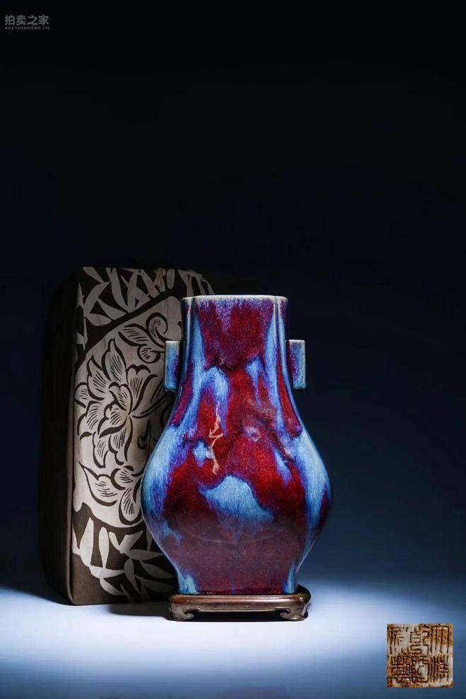 此壺方形倭角,肩設貫耳,形制端嚴,氣度雍容。造型源自商周青銅尊彝,然以清代工藝重塑,方中寓圓,稜角轉折間流露沉穩大氣之勢。通體施窯變釉,釉色尤為絢爛。紅釉深若凝血,濃處熾烈似火,藍釉則清澈如海,於器身交融暈染,宛如彩霞流雲,水墨淋漓。釉色層次繁複,流動自然,釉質潤澤厚實,為乾隆御窯窯變工藝之集大成者。底署「大清乾隆年製」六字篆書款,字體端謹。另配舊木盒,墨書題籤「乾隆宮窯辰砂貫耳花瓶」,當為舊藏傳世。乾隆一朝御窯精益求精,尤好追求奇絕釉色,然成器率極低。此類窯變釉大器,器形碩大,釉色絢麗且保存完好者,傳世寥若晨星。此件不僅品相優美,釉彩尤見神采,誠屬乾隆御窯窯變之珍稀名品,難得一見。