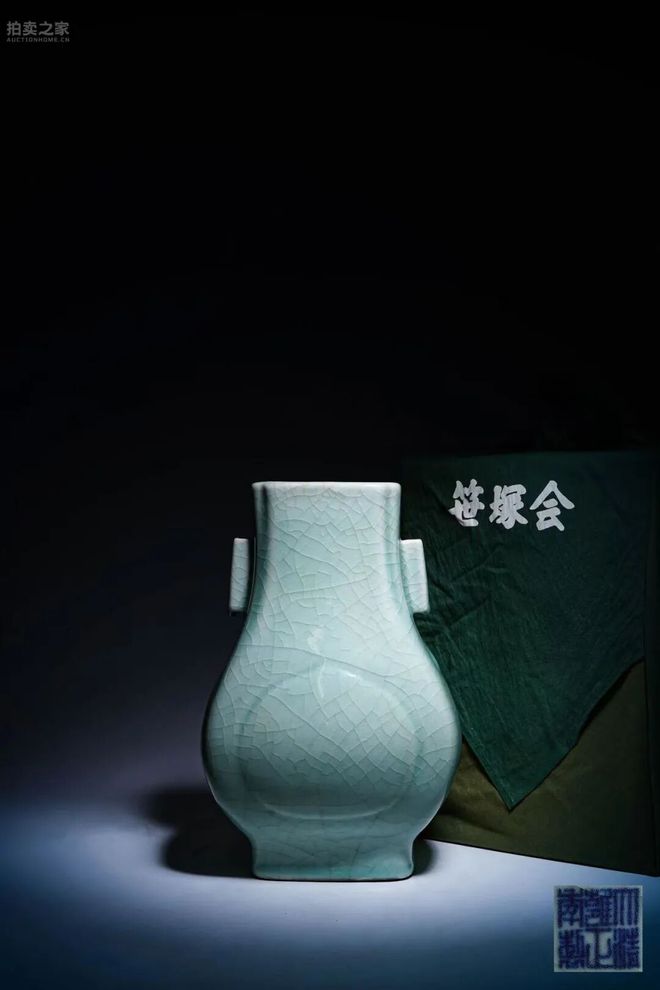 1105 号 清雍正翠青釉四方倭角杏园贯耳方壶,器形端严凝重,通施翠青釉,釉质莹润如青玉,遍布冰裂纹。双耳处垂釉如瀑、釉滴圆润,尽显御窑控火掌釉的极致水准,此类完整大器传世极罕。