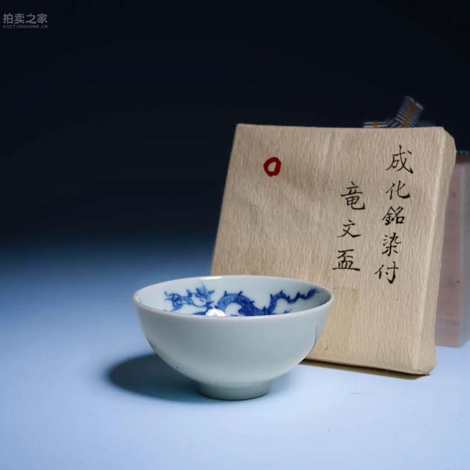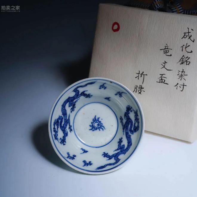 此杯器形小巧精緻,敞口微撇,腹部折腰外侈,圈足修長。胎質細白緻密,施透明釉,光澤瑩潤。內壁以青花繪雙龍戲珠紋飾,兩龍矯健盤旋,姿態靈動,神采飛揚,中央繪火焰寶珠一枚,寓意祥瑞。青花發色濃妍明快,層次分明,線條剛勁流暢,筆觸頗具康熙時期之典型風格。底書「大明成化年制」四字雙行青花楷款,款識端莊嚴謹,實為康熙朝摹古成化之佳例。康熙一代多摹古前朝名品,而折腰杯器形清秀、用途特殊,尤見典雅。此杯器型小巧,構圖簡潔,紋飾典雅,胎釉精良,青花發色艷而不浮,乃康熙摹古瓷中之佳品,殊為難得。