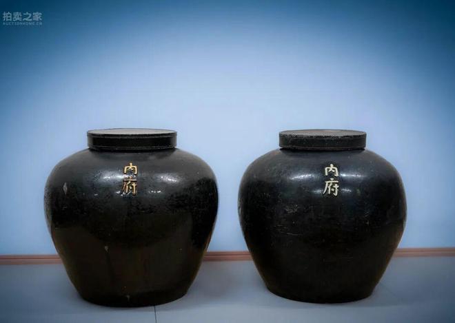 此對大缸胎體厚重,造型碩大渾厚,腹大口收,肩圓而下斂,器形端莊穩健,具備元代大型儲物器之典型風貌。通體施黑釉,色澤沉穆深邃,於光線下泛現虹彩油潤之光斑。釉層局部呈現自然開片與窯變之痕,古樸蒼然,氣息厚重。缸腹正中以模印「內府」二字款識,字體端勁峻拔,釉色金黃泛赭,於黑地之上尤顯醒目。此為宮廷御用器物之明證,顯示其應為皇家專供之大型實用器,或用以貯藏穀物、酒釀,或為禦窯所燒製之專供御府之器。大缸底部經歲月沖刷,留有自然磨痕與陳年舊沁,積累出斑駁的時代痕跡。整體保存完好,成對傳世尤為難得,體量碩大,氣勢雄渾,為元代黑釉器物中罕見之精品。