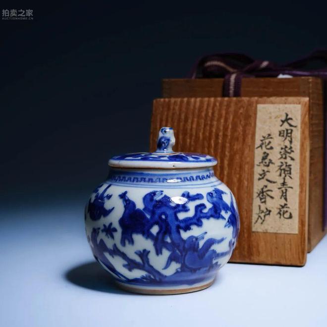 此香爐器形小巧,侈口,豐肩,圓腹,下承矮圈足。胎質潔白細膩,釉面瑩潤。蓋作平頂式,上設鈕,並開三孔以通煙氣,實用與裝飾兼具。全器以青花繪花鳥紋飾:花木葱鬱,禽鳥翻飛,或棲或翔,構圖生動自然,意境清新典雅。青花發色濃妍鮮麗,層次分明,具明末崇禎時期之典型風格。此類小型香爐,多置於書齋几案,以供焚香清神。此件形制精緻,紋飾雅致,保存完好,誠為明末青花小品之佳作,不可多得。