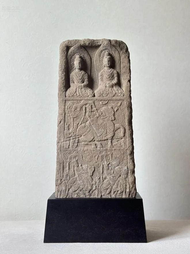 「二佛並坐」是中國佛教藝術特有的造像題材,在 北魏至隋代盛極一時,以釋迦、多寶二佛並坐為典 型特徵,源於《妙法蓮華經,卷四.見寶塔品》。 經中記載,過去多寶佛行菩薩道時發大誓願,若成 佛、滅度之後,於十方國土有說《法華經》處,為 聞是經,多寶塔必現,為作證明。當釋迦佛欲說法 華之際,多寶塔從地踴出,釋尊分身雲集,依眾之 请,開啓塔戶,多寶佛邀请釋迦佛入塔,並分半座 與釋迦佛,「爾時,大眾見二如來在七寶塔中師子 座上結加跃坐」。兩佛獨立並列,頭部各有舟型背光,眉目清新秀氣, 大耳垂肩,身著古式袈裟,質地厚重,二佛皆做禪定印手勢,結跏跌坐,衣擺覆蓋於须彌座前,下方淺浮雕刻畫了一組貴族供養人騎馬出行禮佛的畫面,整件造型古樸,刻畫簡飾,流暢自然,刀法犀利,透出智慧、慈悲、安詳、高貴之氣質!