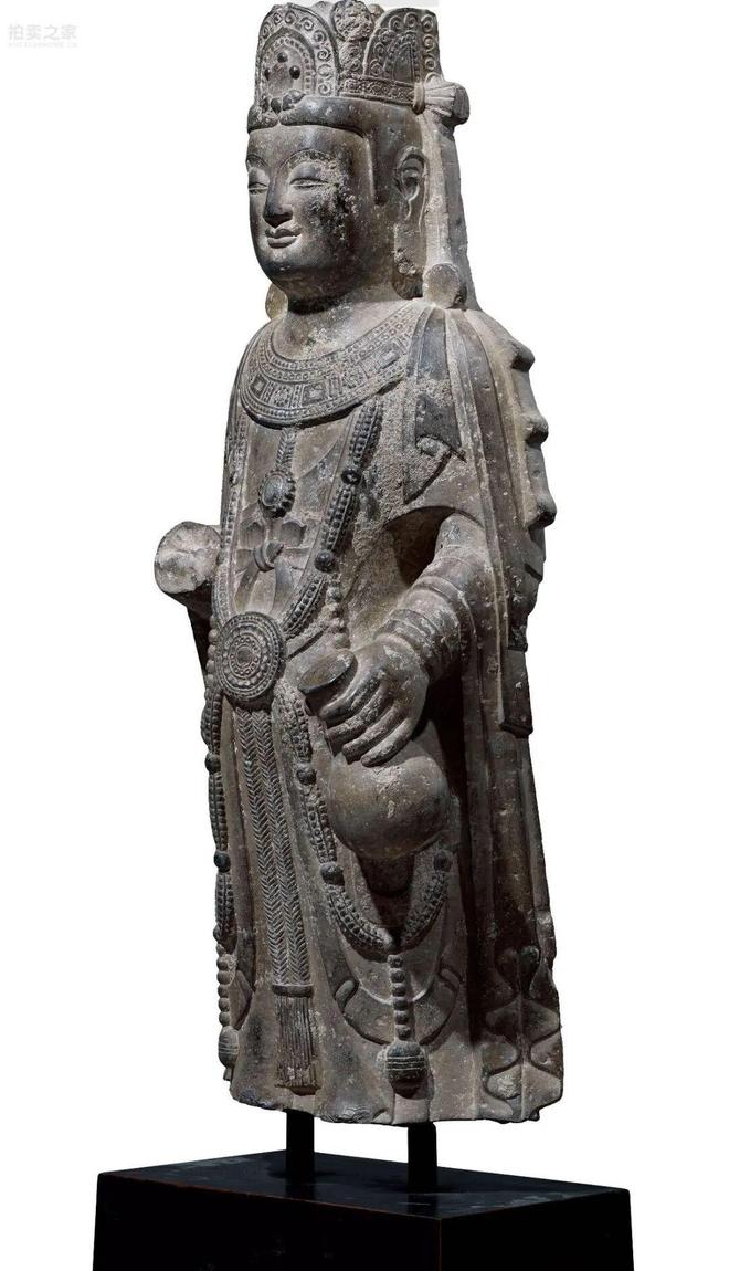 高髻、戴寶冠、面呈圓形、慈眉善目,大耳垂肩,雙唇微厚,上唇呈「弓」形,嘴角略上翹,刻畫精細,形態肅穆,具有較為典型的面短而艷的特點,左臂上舉(殘),右臂下垂,手持淨水瓶。,雙肩渾圓,被巾下垂於胸腹之際。飾連珠紋項圈,胸前瓔珞呈U形,與飄帶相齊,腹部有環形飾物,瓔珞通過環形垂至膝。菩薩石雕像造型勻稱豐滿,形態莊嚴優美,,尤其是胸前項飾及瓔珞雕刻精細,美觀大方,極具裝飾意味。