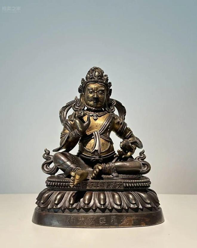 此尊佛像见肉泥金,表皮烧古处理,为典型清宮造办处工艺。其头戴五叶冠,发髻高耸,浓眉大眼,连鬓络腮须,呈嗔怒相。上身袒露,肩披帛带,绕双臂于身体两侧自然翻卷;下着裙佩,裙缘錾刻叶纹为饰,饰耳珰、项链、臂钏等。左手托吐宝鼠,右手立于胸前,原手中所持宝物憾失;左腿内盘,右腿屈伸,右舒坐于圆边三角形覆莲底座上,座上沿刻“大清乾隆年敬造”,下沿刻“真達羅藥叉大將”,莲座背面刻“德行根本”。其做工精细,铜质精良沉实,制作考究,属典型乾隆宫廷造像,亦为乾隆时期六品佛楼中作供奉的佛教造像之一。真达罗(梵语:Sindura/Cindala) 白虎,又作新达罗,意译为执想。此大将的本地为普贤菩萨,是寅时之守护神。现笑怒容貌,身呈黄色。此尊真達羅藥叉大將整体姿态极似藏传佛教中的黄财神,这为真達羅藥叉形象的确定与研究起到了至关重要的作用。六品佛楼是清宫重要的建筑形式,为两层楼建筑,共七间,除正中一间(即明间)楼上下分别供奉宗喀巴大师像与释迦牟尼佛像之外,左右三间按照般若品(大乘佛教)、无上阳体根本品(无上瑜伽部父续)、无上阴体根本品(无上瑜伽部母续)、瑜伽品(瑜伽部)、德行根本品(行部)、功行根本品(事部)的顺序布置。故称“六品佛楼”,体现了藏传佛教显密兼修思想。从此尊莲座背部“德行根本”款并参考故宫梵华楼所奉同类造像,可知其当位于五室楼上德行根本品壁龛中。此尊造像胎体厚重,铜质莹润,造型规整,工艺精细,應确定为以梵华楼为代表的清代乾隆宫廷六品佛楼风格造像。