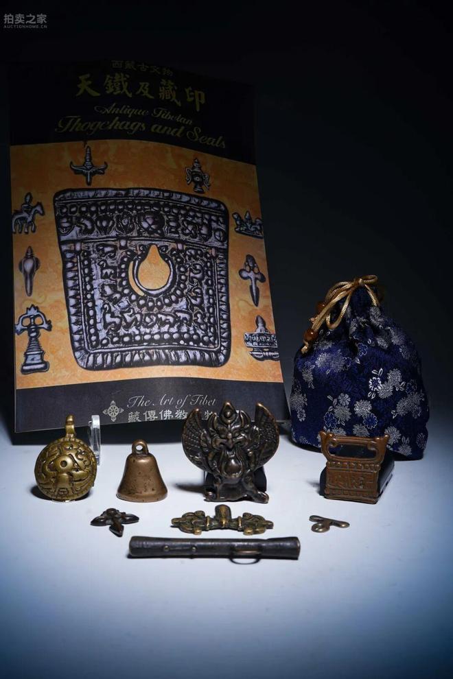 此八件天鐵及藏印包括護法神面像飾件一枚、銅鈴一枚、圓形浮雕瑞獸飾一枚、藏文銅印一枚、杵形法器一枚、金剛杵飾件一枚、T字形飾件一枚,以及橫置鐵製器一件。飾件造型多樣,紋飾內容涵蓋護法神面、金剛杵、藏文吉祥字及瑞獸圖像,象徵護佑、辟邪與吉祥。其製作工藝樸拙厚重,風格鮮明,具濃厚藏傳佛教文化特色,應為藏地隨身供奉或修法佩飾之用。其中「藏印」保存完整,銘文清晰,當為宗教儀式中法器印信,具有珍貴的歷史與文化價值。另有鐵製件與法器小飾,亦為修法、護身或供養所用。整組組合齊備,件件各具象徵意涵,彌足珍貴,尤為研究藏傳佛教法器、民間信仰及金屬工藝之重要實物。