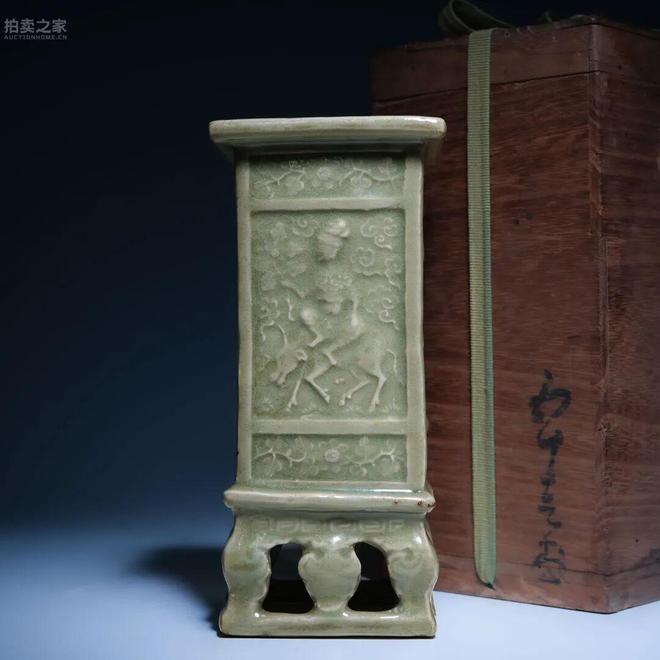 此件四方花插,為明代空白期龍泉窯佳作。器形方正挺拔,口沿外撇,通體施青釉,色澤勻淨柔和,釉層肥潤,呈溫潤青翠之色。四壁模印人物故事紋,人物騎馬、持物,衣褶線條流暢,神態生動,並以雲紋、花卉襯地,裝飾繁而不亂,頗具文人雅趣。下承鏤空聯珠式四足座,線條起伏有致,釉色匯聚處泛現淺褐與開片,釉光盈潤,富層次感。器底露胎處呈火石紅,為龍泉窯燒造之典型特徵。